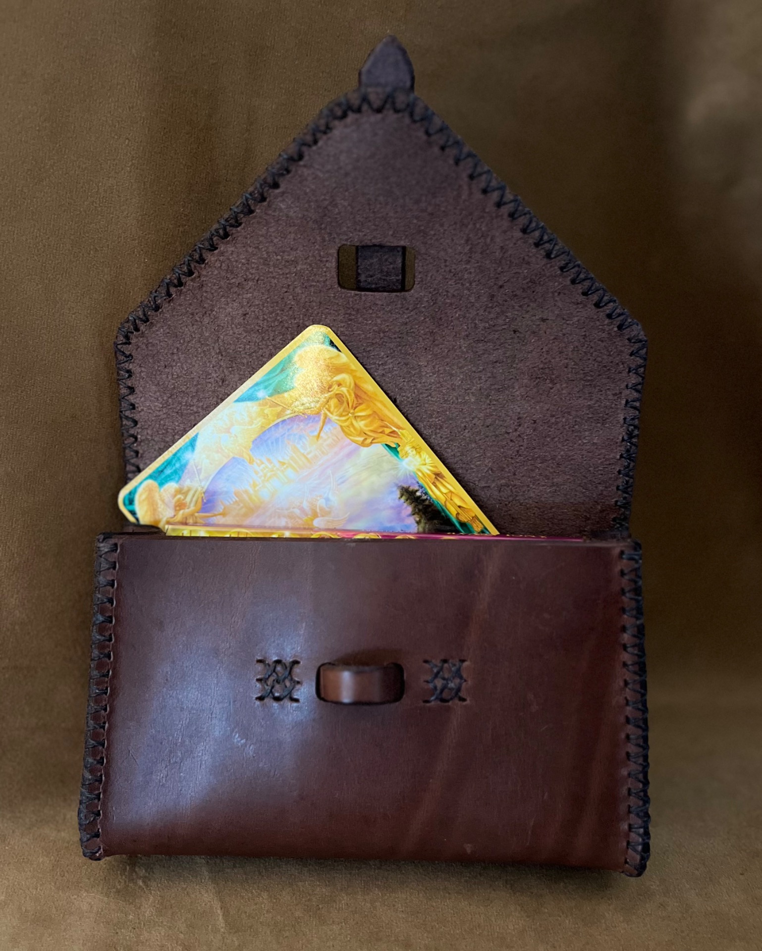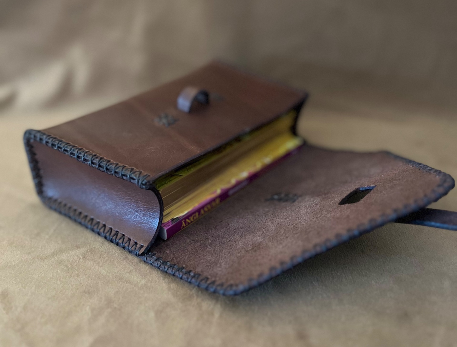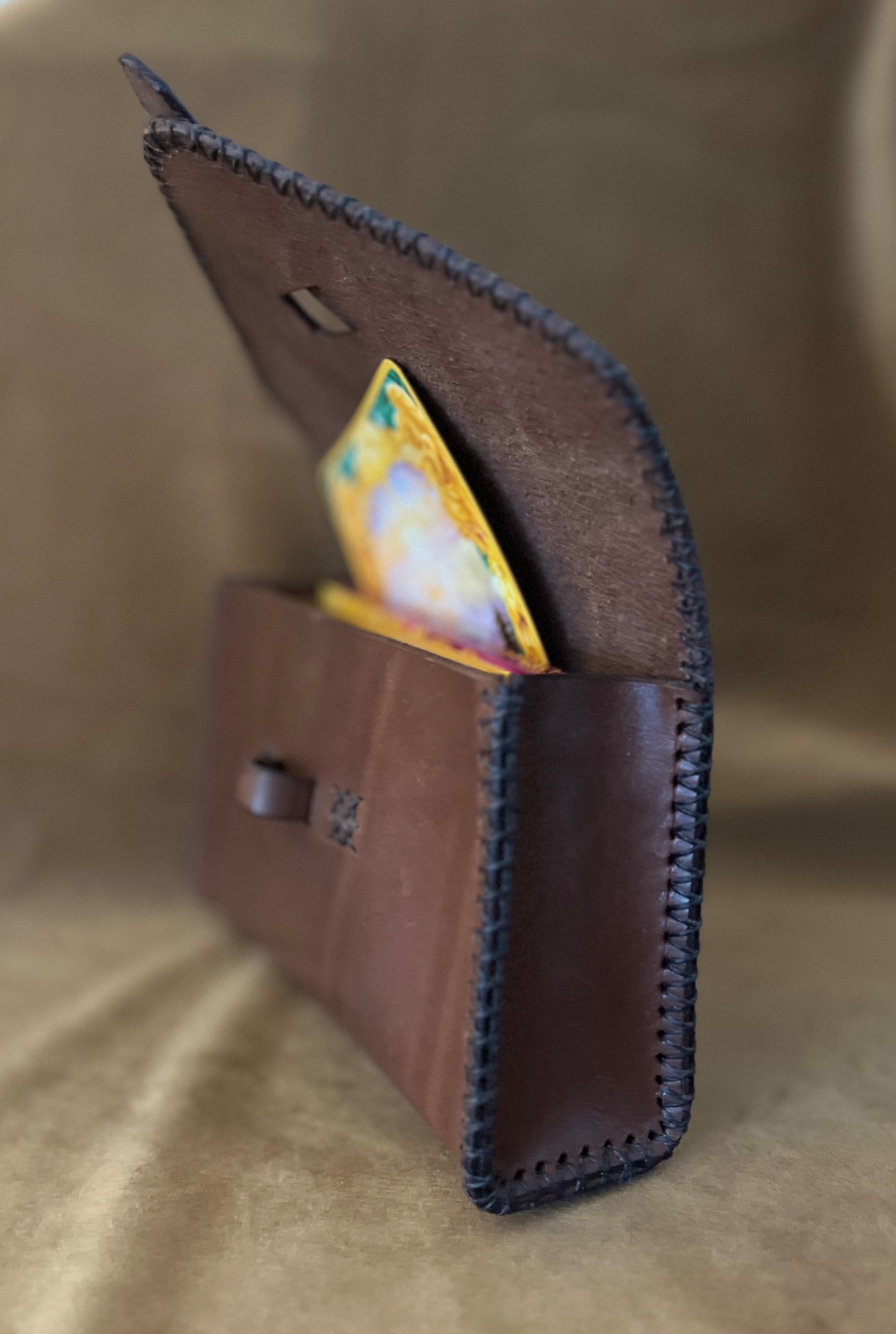 Tillverkad av brunt svenskt vegetabiliskt garvat skinn från Tärnsjö garveri tjocklek ca 2,5 mm.