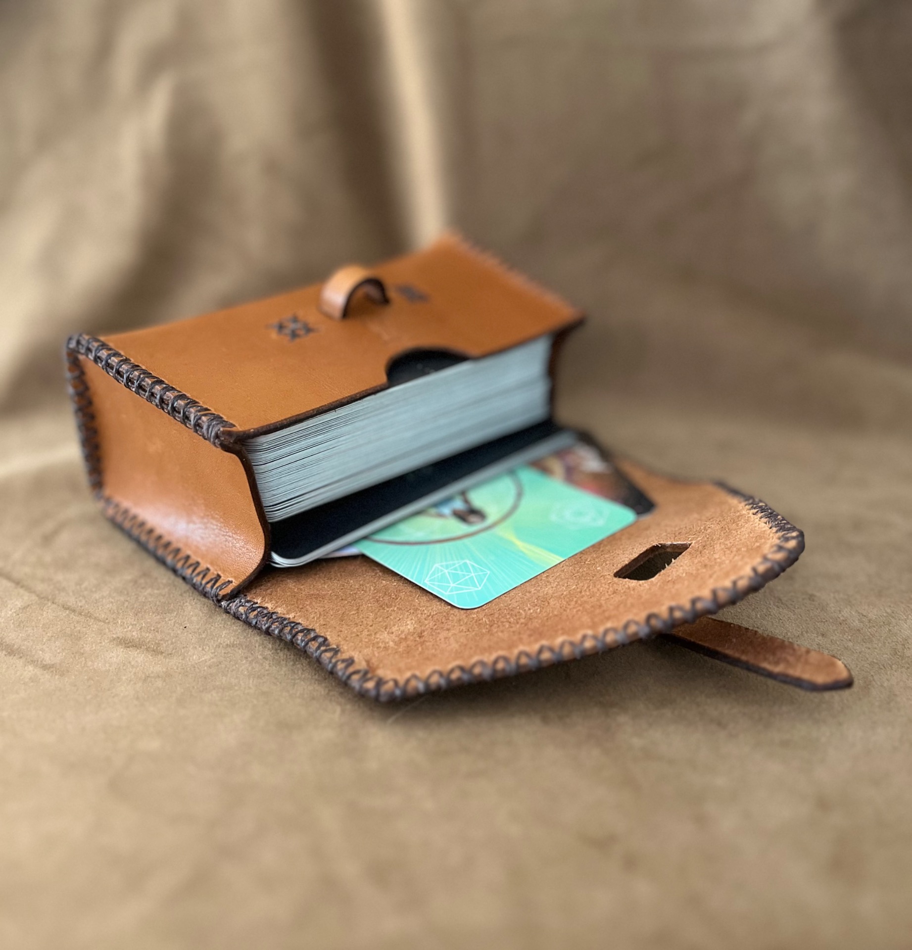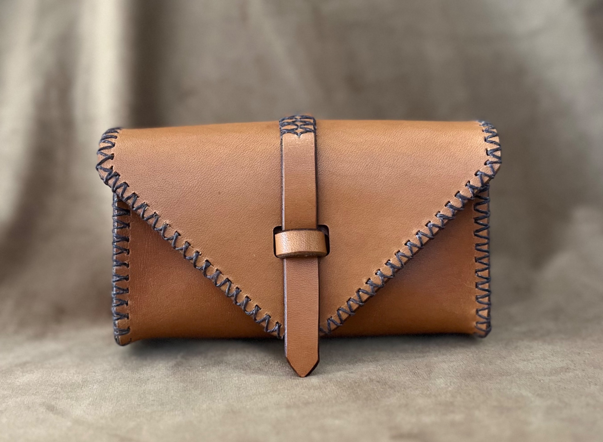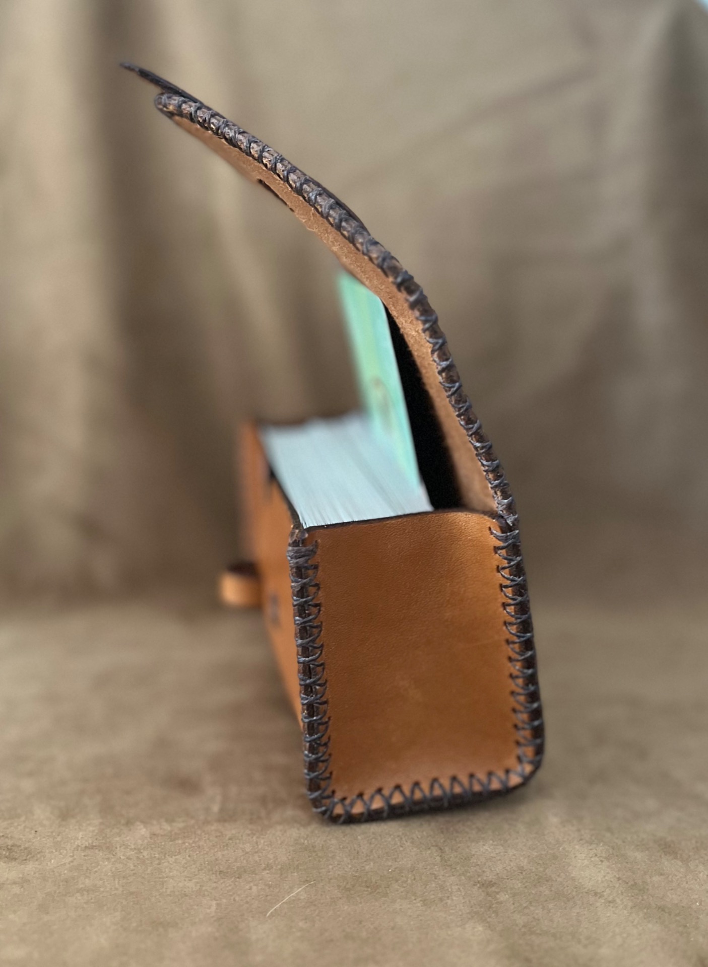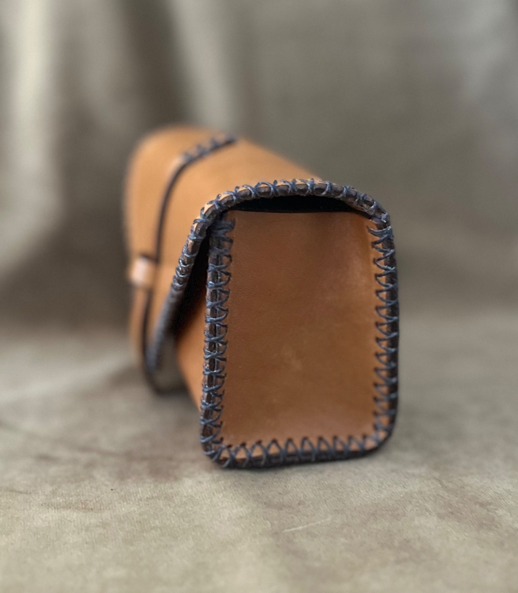 Tillverkad av ljusbrunt svenskt vegetabiliskt garvat skinn från Tärnsjö garveri tjocklek ca 2,5 mm.
